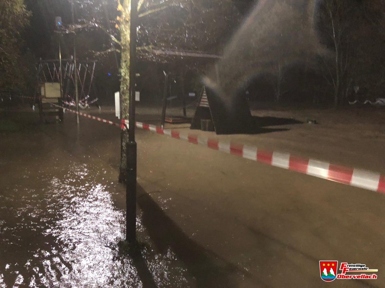 Ab 18:00 Uhr war das Rüsthaus mit einer Bereitschaftsmannschaft ständig besetzt. Mit Bangen wurde der stetig steigende Wasserstand der Möll beobachtet - und regelmäßige Kontrollfahrten durchgeführt. Nachdem die Möll kurz nach 18 Uhr wieder über die Ufer trat, wurde auch die Möllbrücke für den Verkehr gesperrt. Kurz vor halb 9 am Abend wurde wir zu einem verklausten Bachlauf in der Schattseite gerufen. Da die Gefahr einer Vermurung bestand mussten die Anwohner des betroffenen Gebäudes evakuiert werden. Nachdem das Gebäude geräumt und gegen eindringendes Wasser gesichert war, rückten wir wieder ins Rüsthaus zur Bereitschaft ein. Mittlerweilen hatte der Pegel der Möll die 30-jährige Hochwassermarke überschritten und die Überschwemmung der Schattseite nahm ihren Lauf. Im weiteren Verlauf musste die FF-Obervellach nach dem aufkommenden Sturm mehrere Bäume von Gemeindestraßen räumen und mehrere Tiere, die auf ihren Wieden vom ständig steigenden Wasser bedroht waren, mit den Bauern in Sicherheit bringen. Nachdem der Sturm an Stärke immer mehr zulegte, wurde um 23 Uhr für Obervellach Zivilschutz-Warnung ausgelöst und die Bevölkerung über Radio hingewiesen, in den Häusern zu bleiben. Kurz vor Mitternacht erreichte die Möll ihren Höchststand und verfehlte die 100 jährige Hochwassermarke nur knapp. Gegen 1 Uhr vernahmen mehrere Anwohner lautes krachen und ächzen von der Schattseite Bereich Schilift. Nachdem ein Murenabgang befürchtet wurde, machte sich ein Erkundungstrupp auf den Weg, musste aber aufgrund der Überschwemmten Möllbrücke seine Anfahrt abbrechen. Nachdem der Sturm abzuflauen begann und auch der Möllpegel stetig sank, wurde die Einsatzbereitschaft um 3 Uhr beendet und wir konnten für ein paar Stunden nach Hause zu unseren Familien.